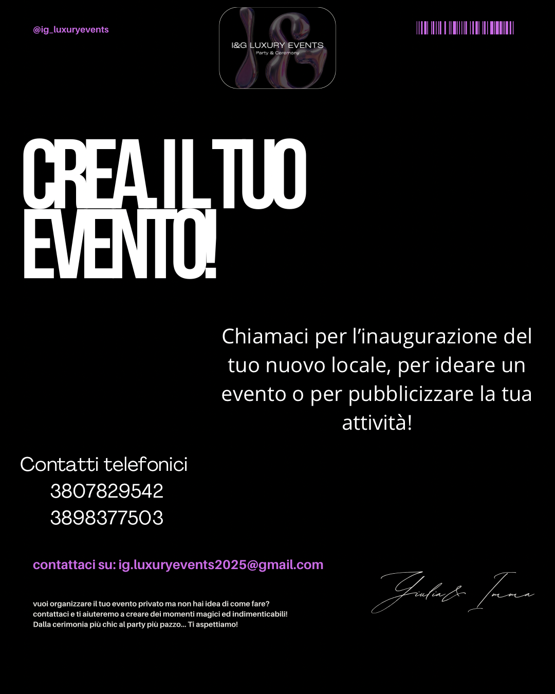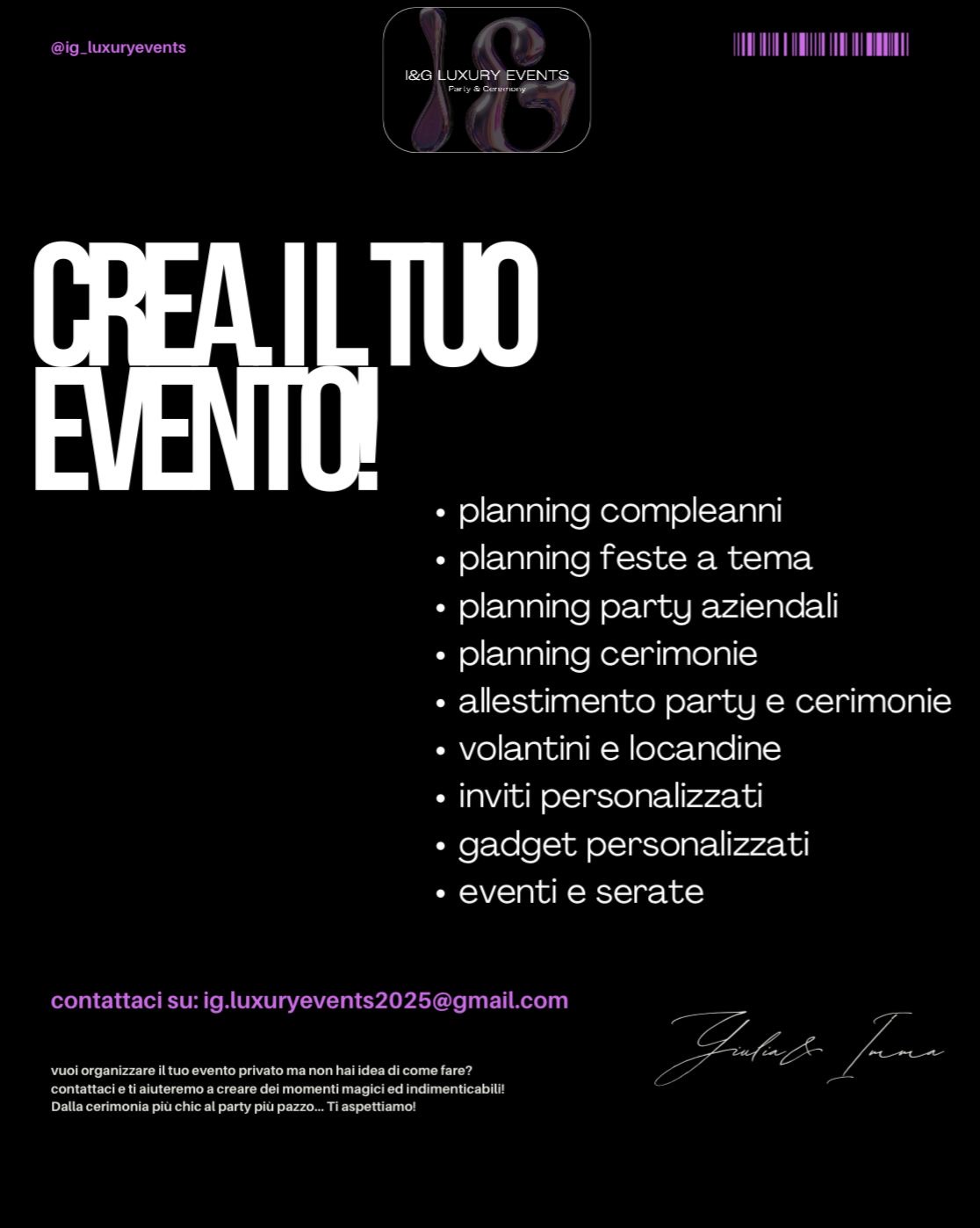 Con passione e creatività, ci impegniamo a creare esperienze uniche e memorabili per i nostri clienti, offrendo servizi personalizzati e di alta qualità. Affidati a noi per un'esperienza di lusso e raffinatezza.